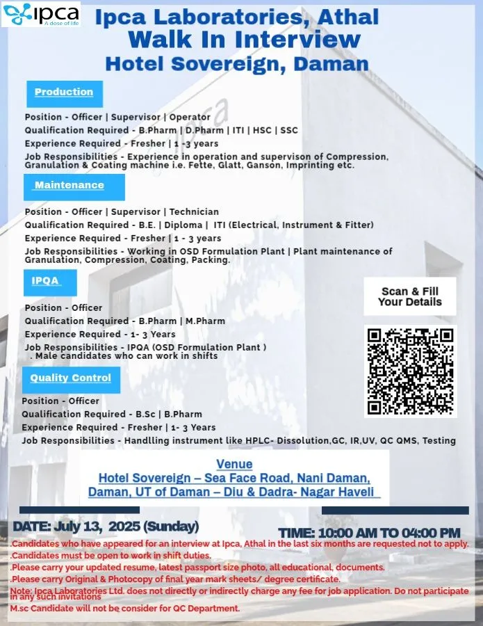 IPCA Laboratories Walk-In Drive – Daman | 13th July 2025