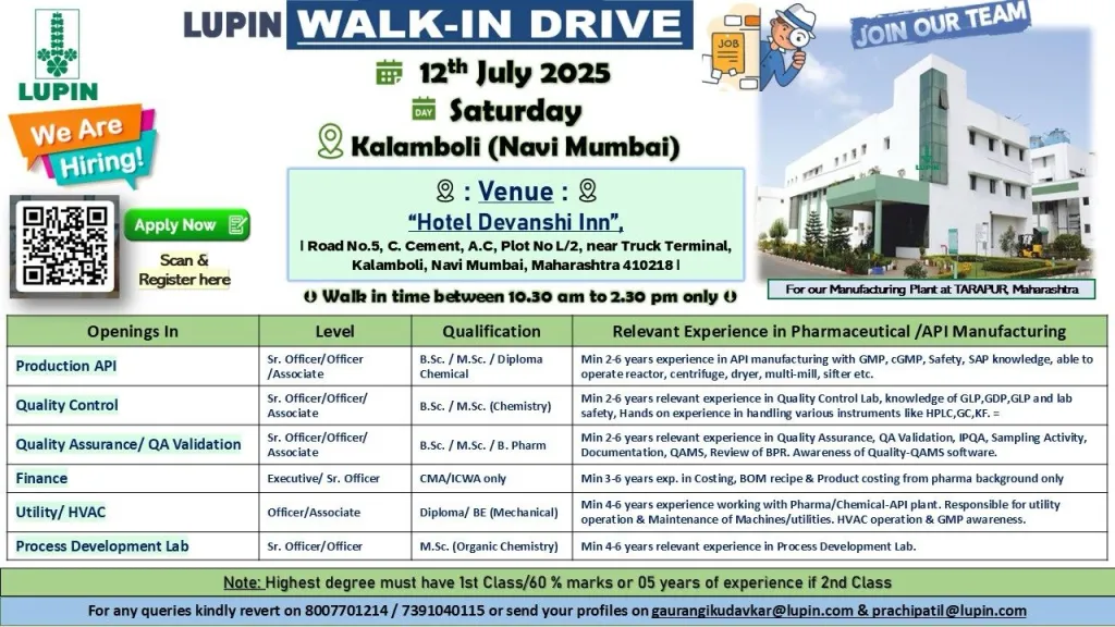 Join Lupin Ltd., one of India’s leading pharmaceutical companies, for a Walk-In Interview for multiple departments for their TARAPUR Manufacturing Plant.