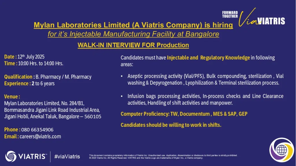 Join Mylan Laboratories Ltd. (A Viatris Company) at their state-of-the-art Injectable Manufacturing Facility in Bangalore and be part of a team that’s advancing global health.
